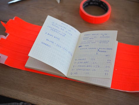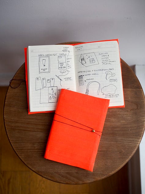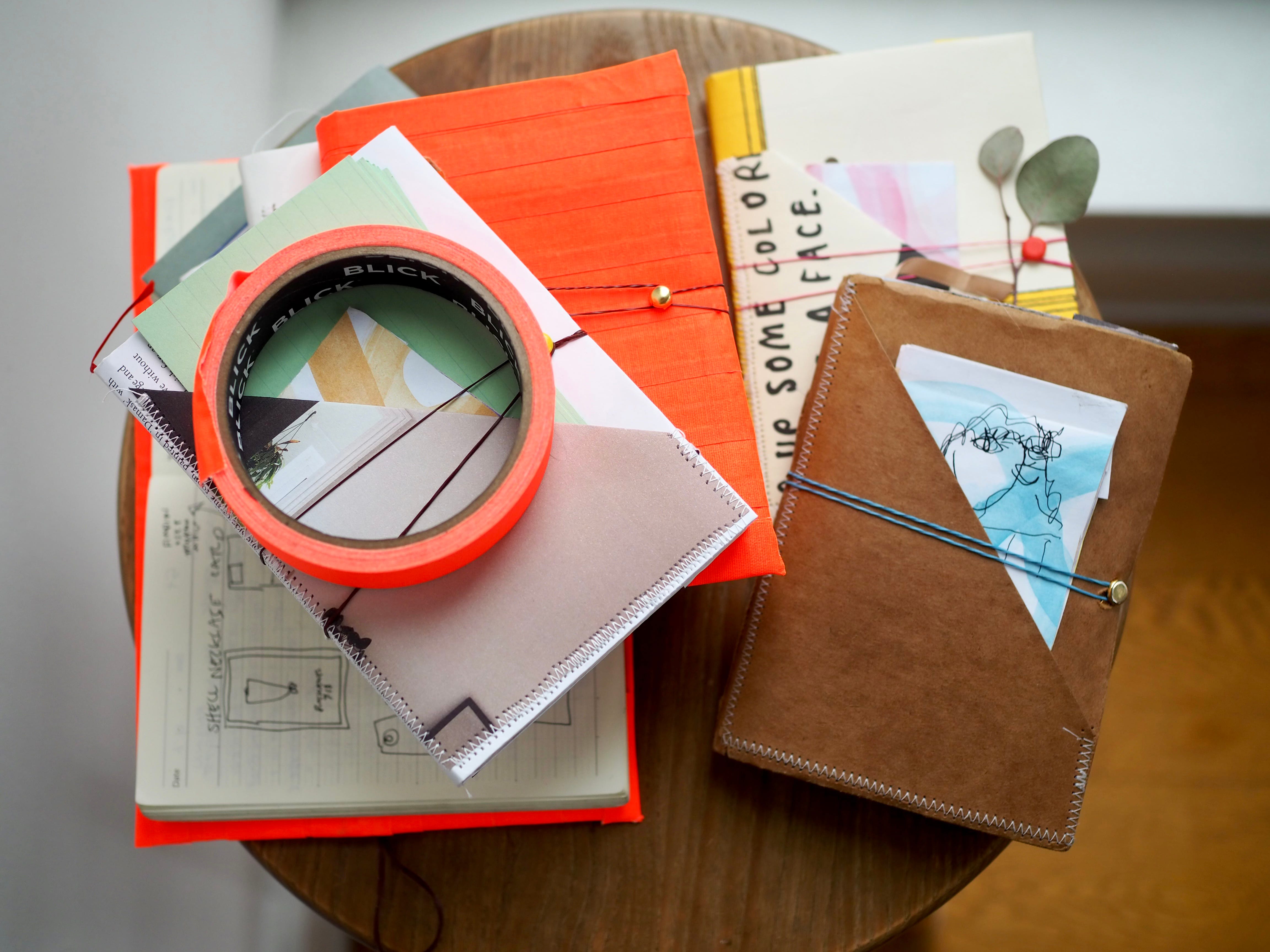 These covers shine in the mishmash of found papers and the contrasting, stitched pockets; like an ever-shifting mini-collage. The cover compartments makes notes and papers easily visible and accessible and the wrap-around rubber band secures it all without the need for a fussy tie. Since I tend to use sized A4 notebooks, having a unique cover is a great way to differentiate the books and notate their content without having to thumb through the pages.