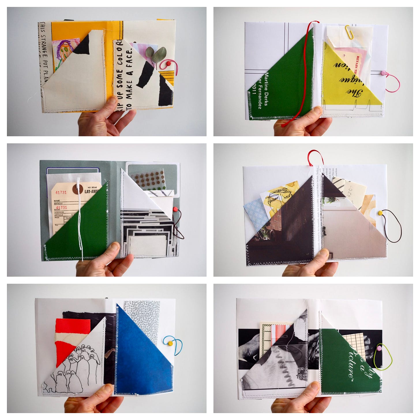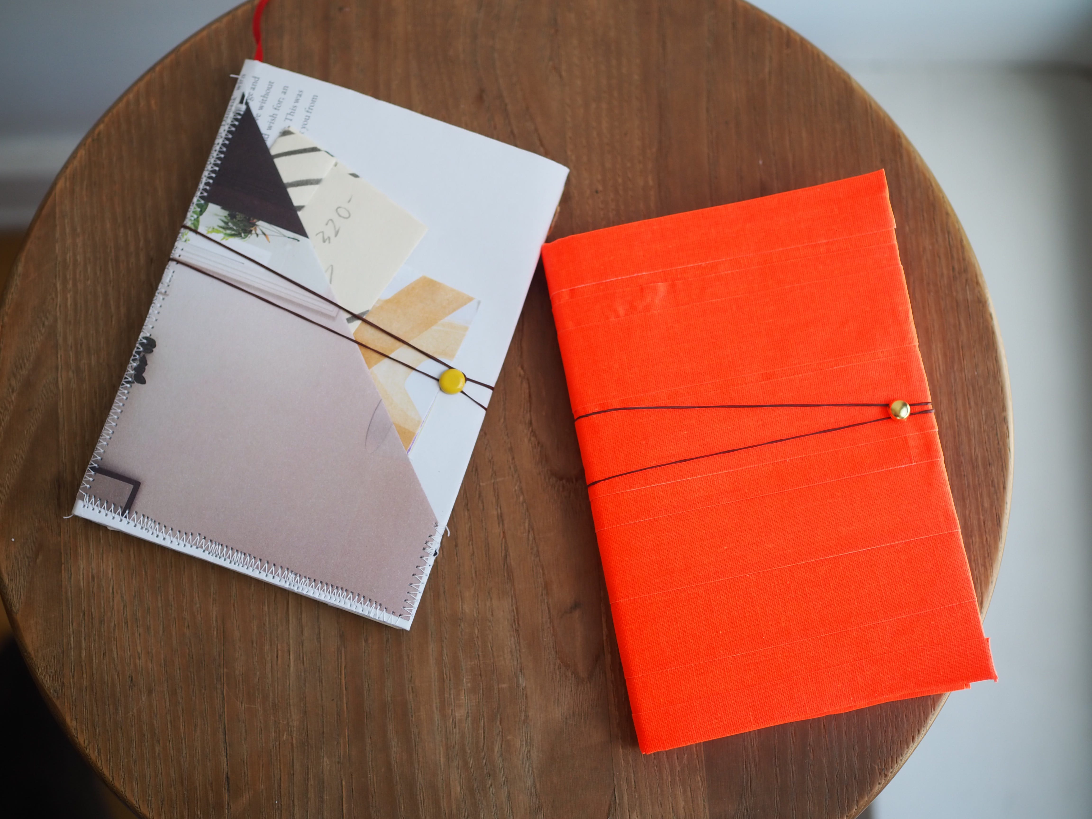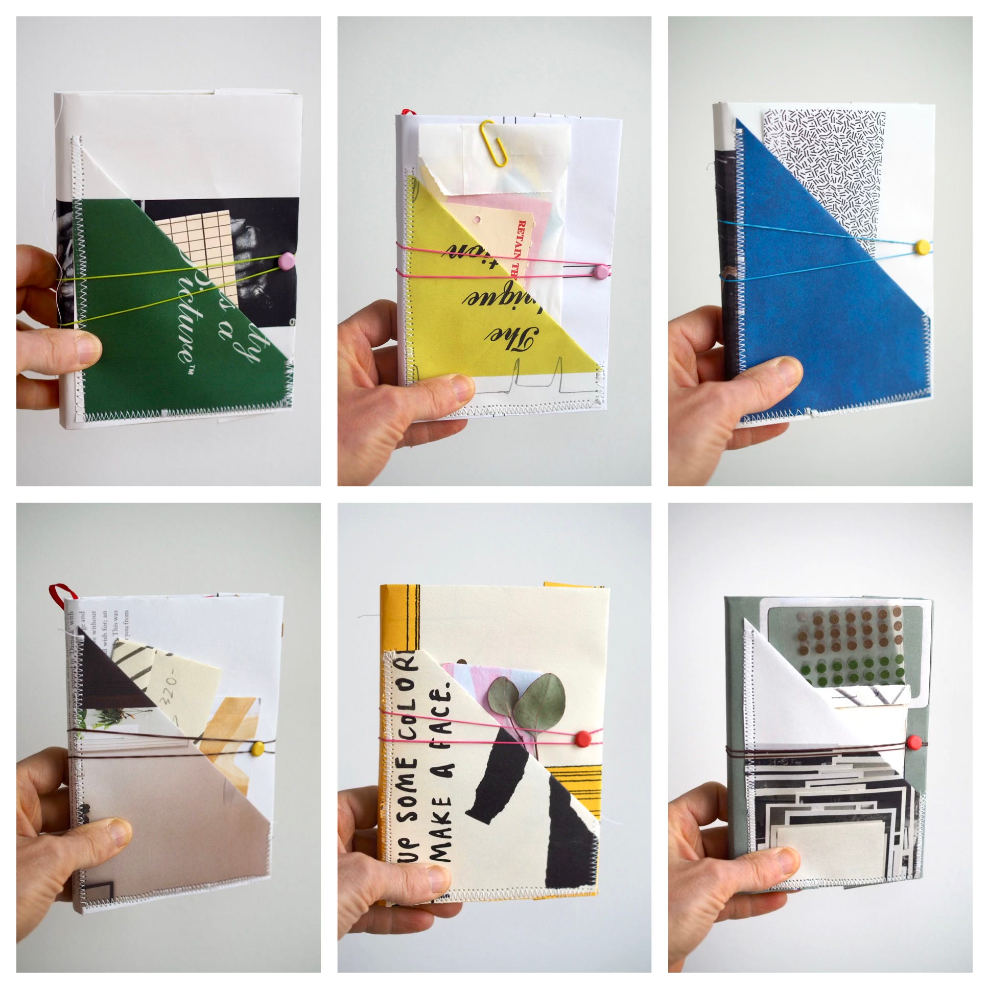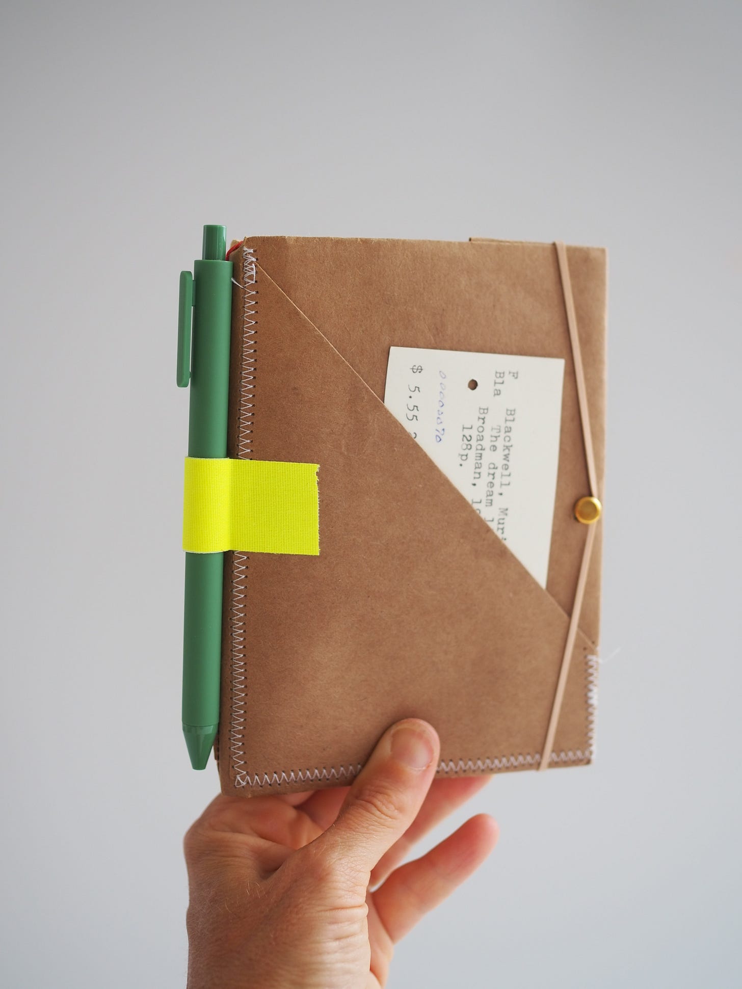 Enter the scrap-paper jacket with pockets; it’s the same foundation of the classic paper-bag cover, but with two sewn-on pockets on the front and back. Punch a hole, add a metal fastener, loop with a rubber-band, and you have a quick bind to protect the contents and secure the book shut.