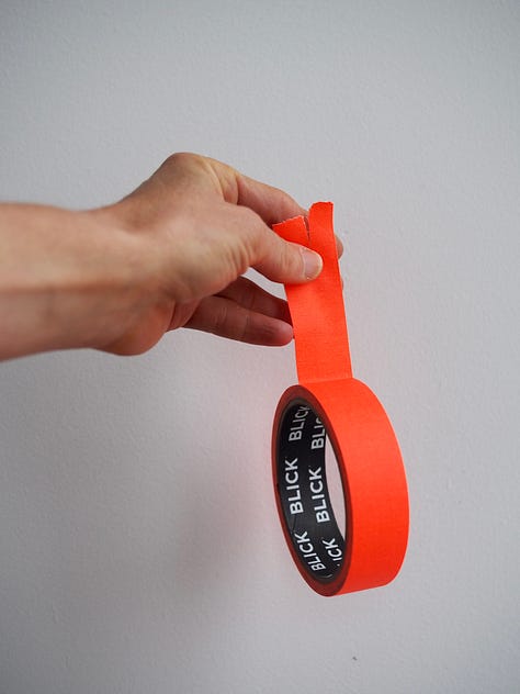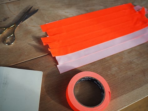 Remember the duct-tape-wallet? This is like that, as you start off with a foundation of ‘fabric’ tape. For this project, I recommend swapping out plastic duct tape for gaffers tape. Gaffers has a matte, woven, cotton surface, comes in a large selection of bright, punchy colors, and fares well over time. The durable material can also be torn by hand and won’t leave a mark when removed from a surface. While gaffers tape can be found in artist supply shops and some hardware stores, when purchasing online, go for the good stuff often labeled “pro”, not the bargain pack rolls commonly called ‘standard’. The tape quality can make a big difference in the outcome and longevity of your finished jacket, and a gaffers journal cover is a good looking, solid alternative to more expensive, store-bought options.