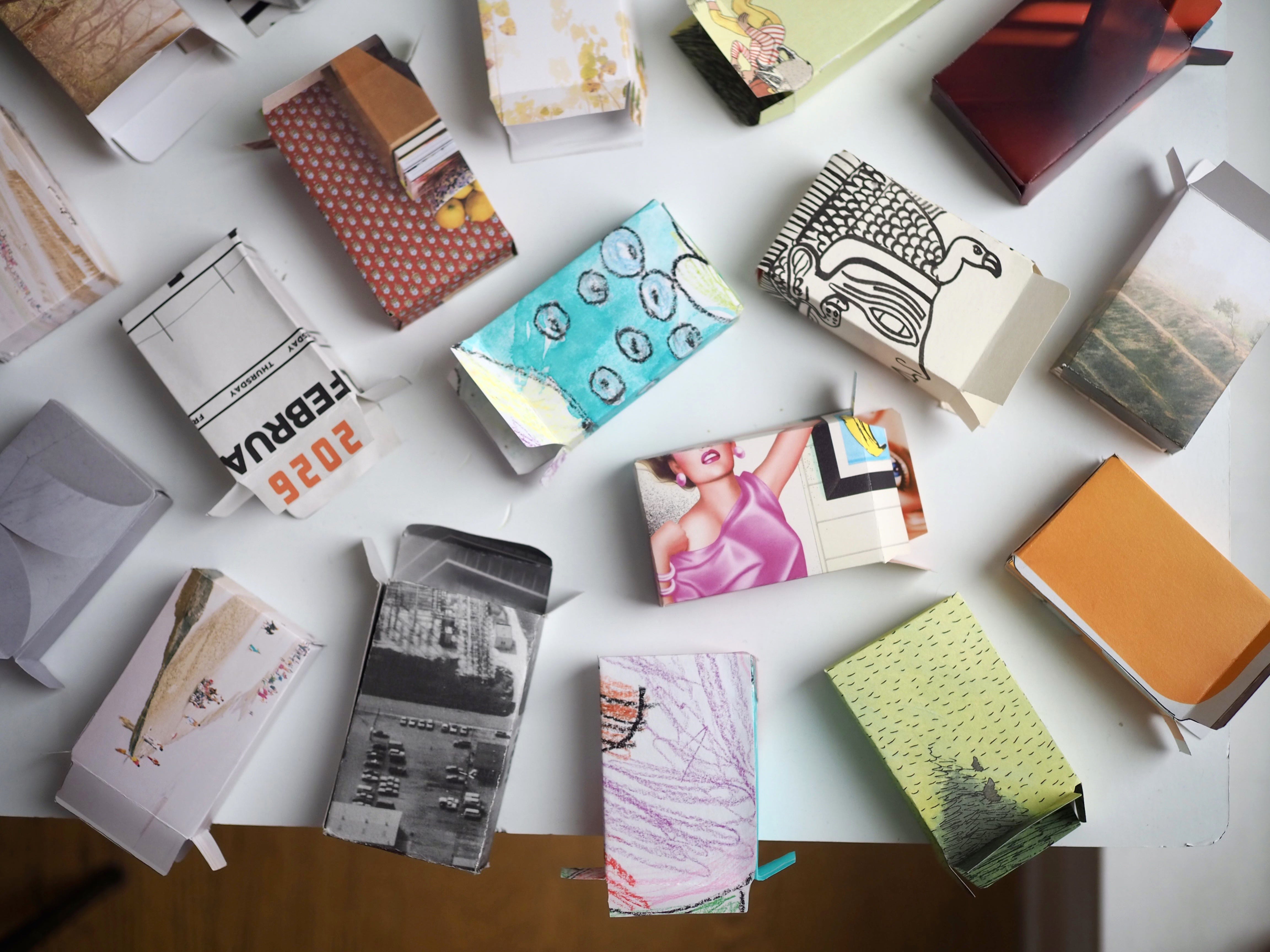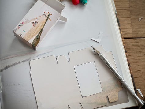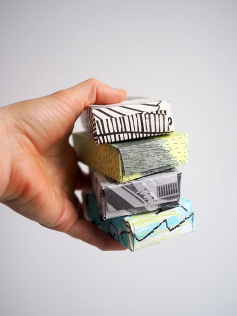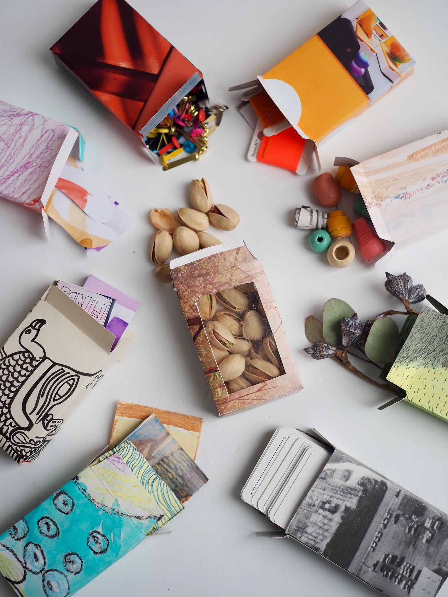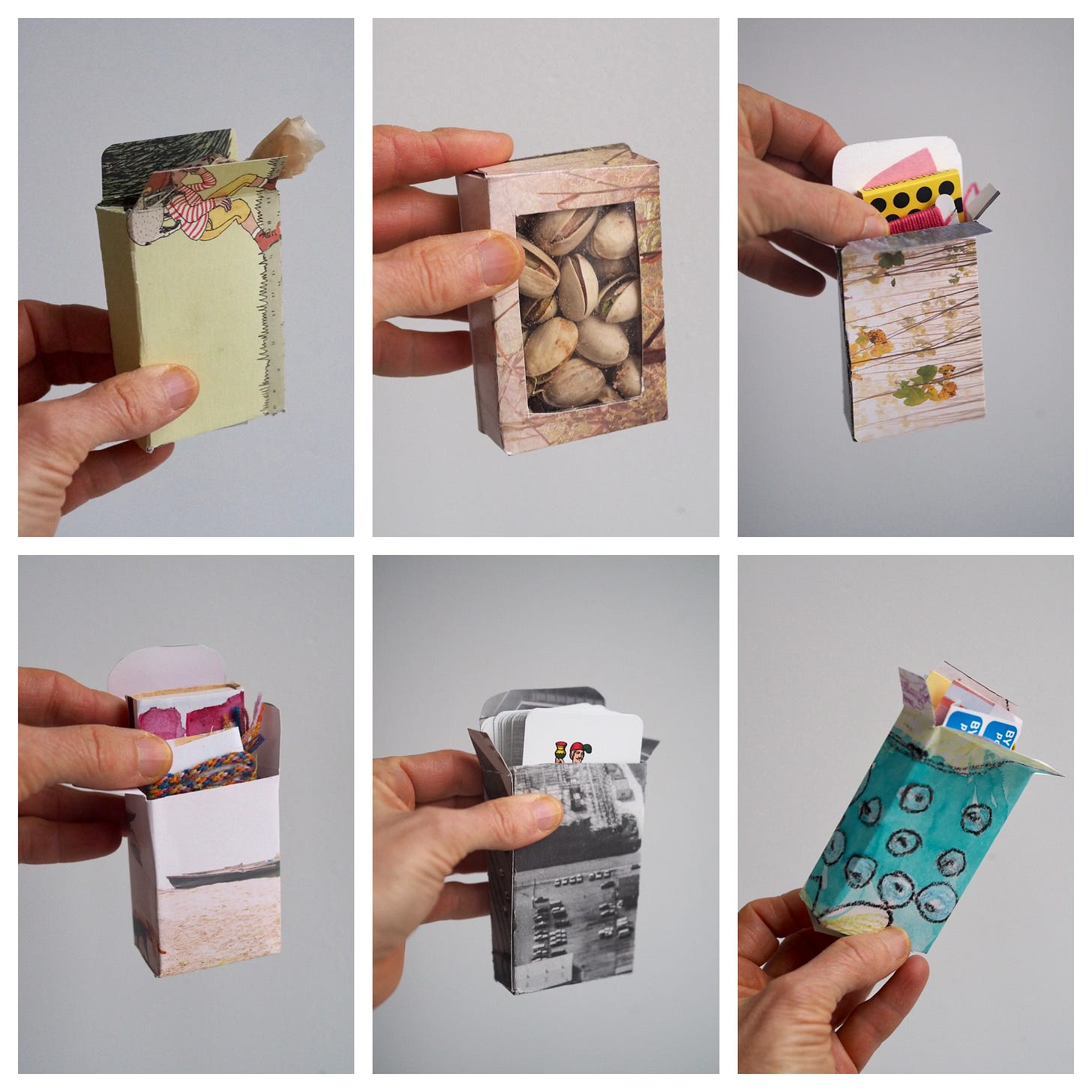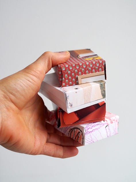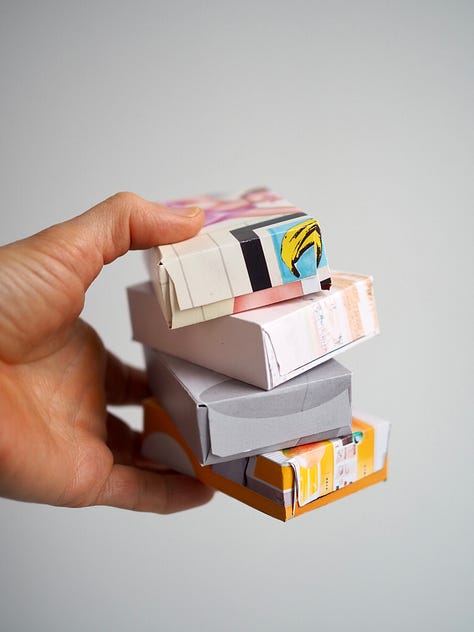 A sheet of paper takes on new life when reimagined into 3 dimensions; the way the front imagery or text wraps the sides and back, the sneak of contrast image from inside the box, the layered tabs when open. Of course, if you are reading this, you probably already scavenge the good papers, rip up the magazines and snatch the picture books from the free library. Once you start to see the potential in the illustration, the font, the photographs, or thick mat paper, you can never again unsee it.