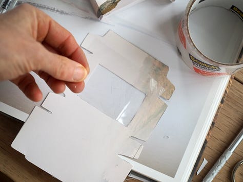 Place a piece of clear packing tape, sticky side up, so that it just covers the cut out window, and on the inside of the box (the side you won’t see).