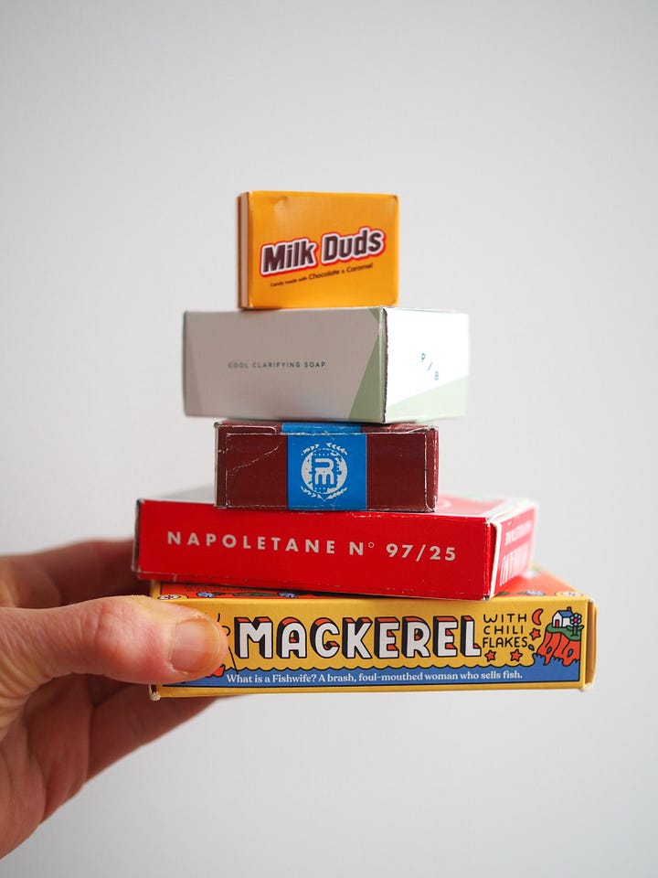 Small, compact boxes, like the candy cigarettes I purchased, are made from paperboard and constructed simply with a fold-in flap or an overlapping glued seal. These boxes can easily be duplicated with your own stash of paper scraps, paste and a scissor. Like the pocket treat post, there are all sizes of templates, hidden in plain sight and everywhere that you shop, that can be used to make functional packaging.